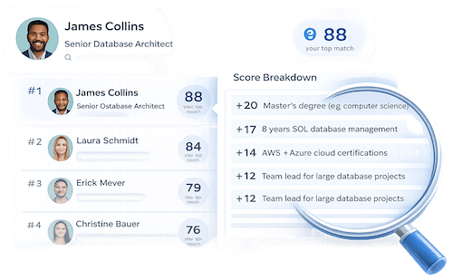 Search talent like Google with transparent matching logic, supporting faster internal staffing decisions.